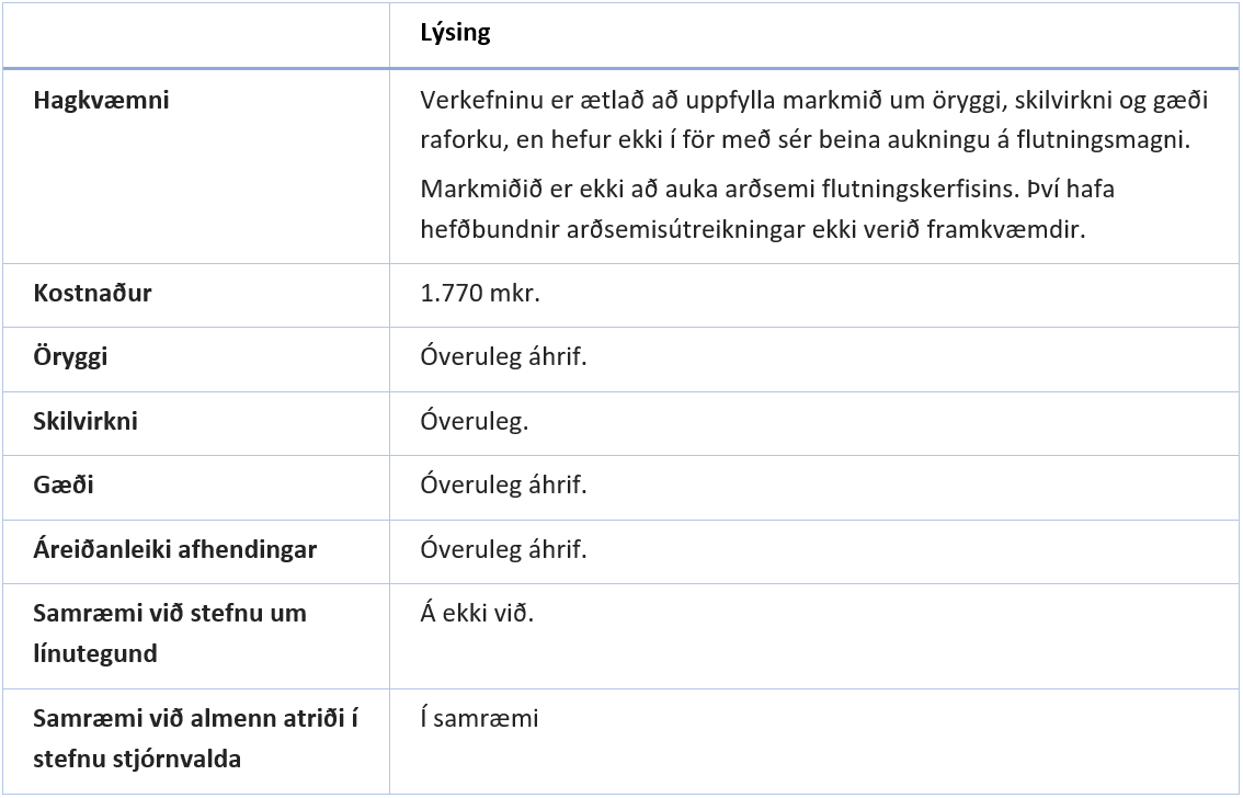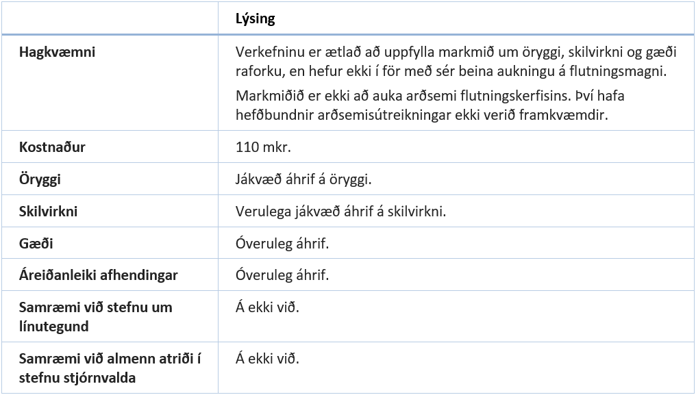 Tafla 3-173 sýnir niðurstöðu mats á því hvernig verkefnið uppfyllir markmið raforkulaga, samkvæmt mælikvarða sem lýst hefur verið, og mat á því hvort verkefnið sé í samræmi við stefnur stjórnvalda. Einnig inniheldur hún fjárhagslegar upplýsingar um verkefnið. Matinu er lýst nánar í töflum 3-176 og 3-177.
