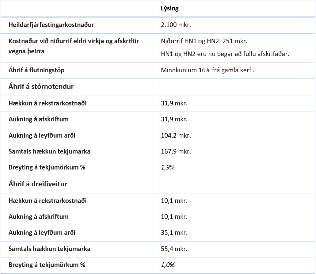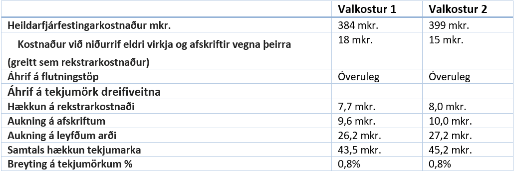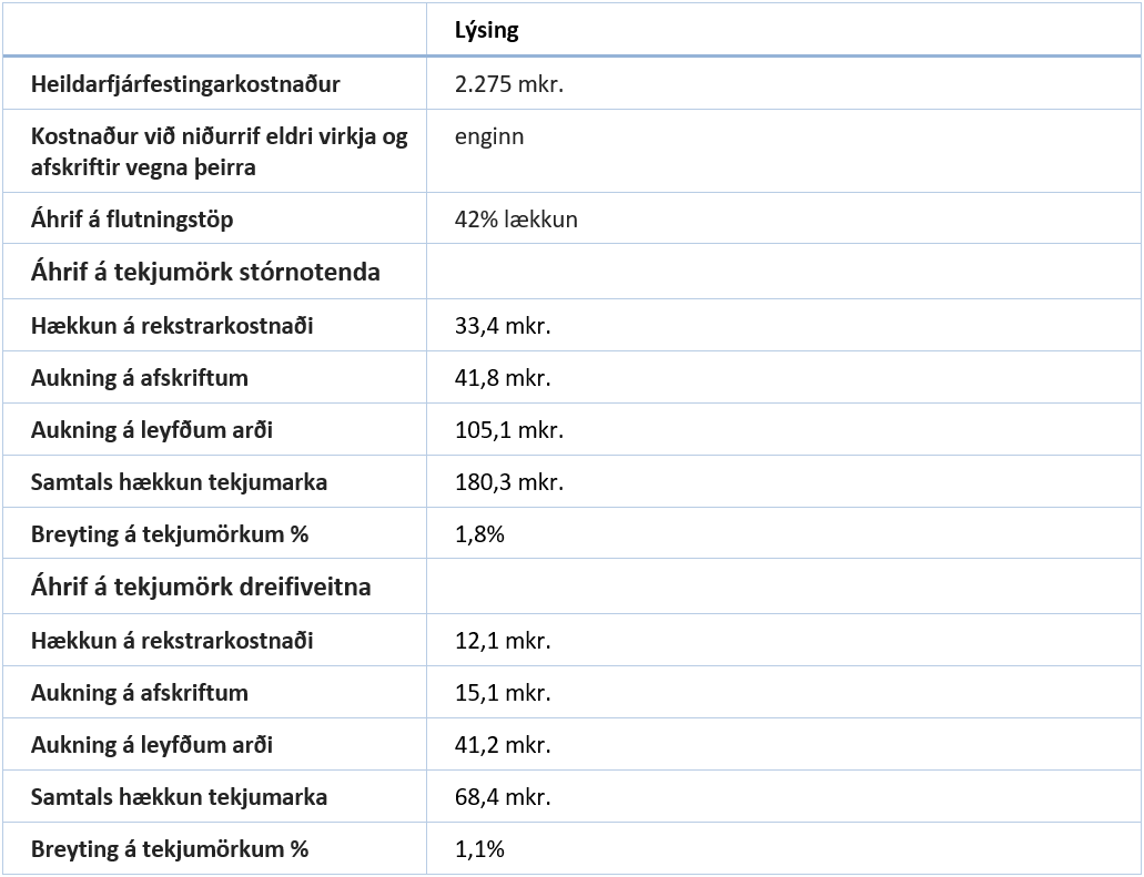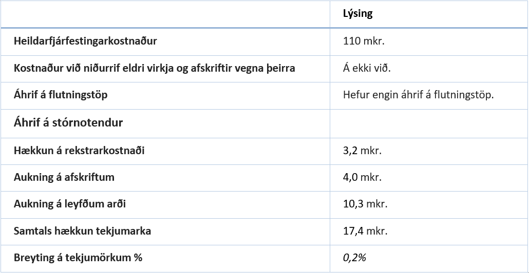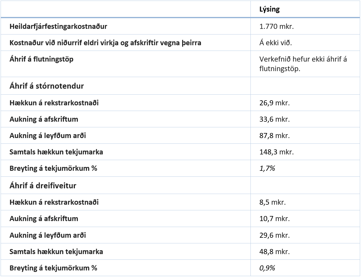 Tafla 3-170 inniheldur fjárhagslegar upplýsingar um verkefnið. Heildarkostnaður við verkefnið er 1.770 milljónir króna og verkefnið hefur áhrif á gjaldskrá hjá bæði stórnotendum og dreifiveitum.