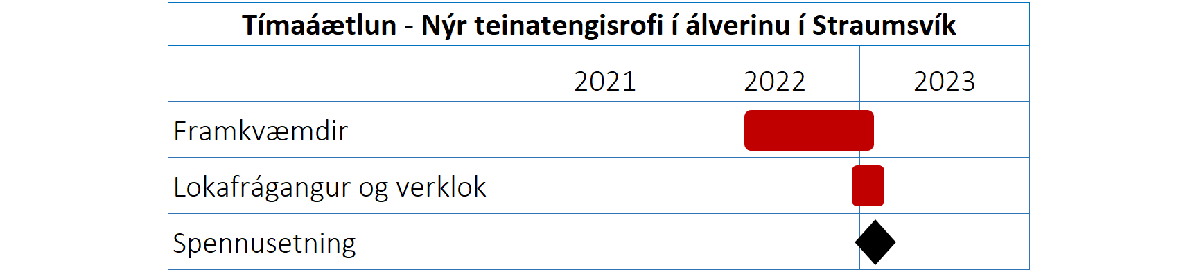 Gert er ráð fyrir að framkvæmdir hefjist á fyrsta ársfjórðungi 2022 og að þeim ljúki ári síðar. Spennusetning er ráðgerð á fjórða ársfjórðungi 2023 og verður frágangi við lóð lokið haustið 2023.Valkostagreining