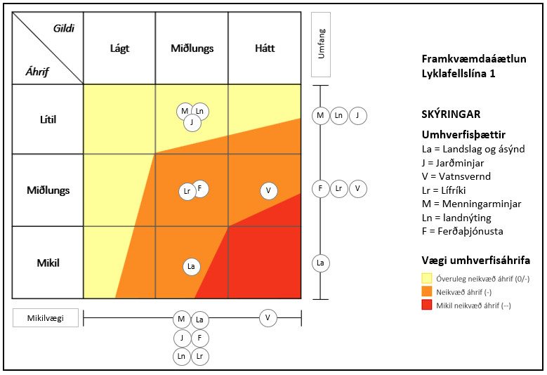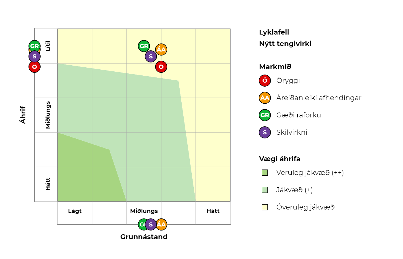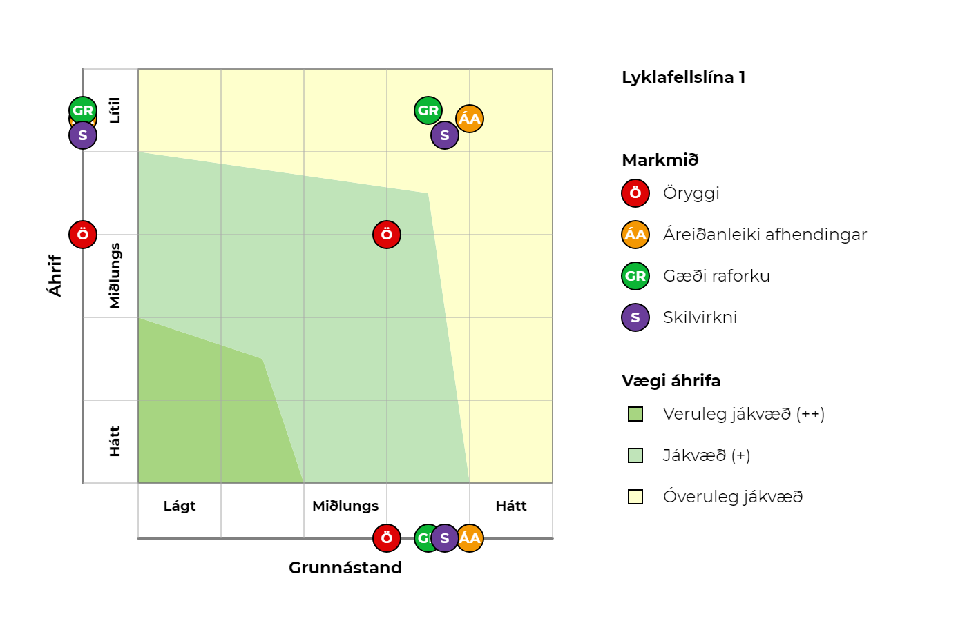 Mynd 3-67 sýnir mat á því hvernig Lyklafellslína uppfyllir markmið raforkulaga. Samkvæmt matinu eru áhrif framkvæmdarinnar áreiðanleika afhendingar, gæði raforku og skilvirkni óveruleg. Aðeins fyrir öryggi er framkvæmdin talin hafa jákvæð áhrif þar sem að orka til stærsta notandans á svæðinu verður flutt um tvö aðskilin sett af möstrum í stað flutnings með tveggja rása möstrum eins og staðan er í dag.