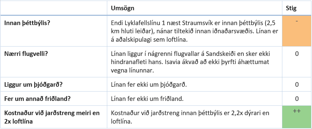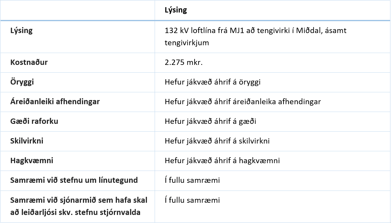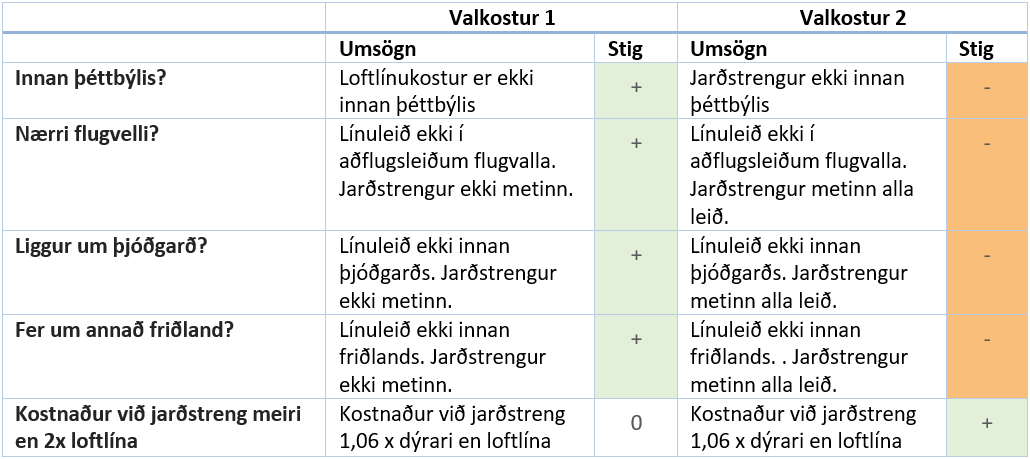 Það er því niðurstaða valkostagreiningar að Valkostur 1 er sá valkostur sem best uppfyllir öll markmið og samræmist best stefnu stjórnvalda um uppbyggingu flutningskerfisins og lagningu raflína.