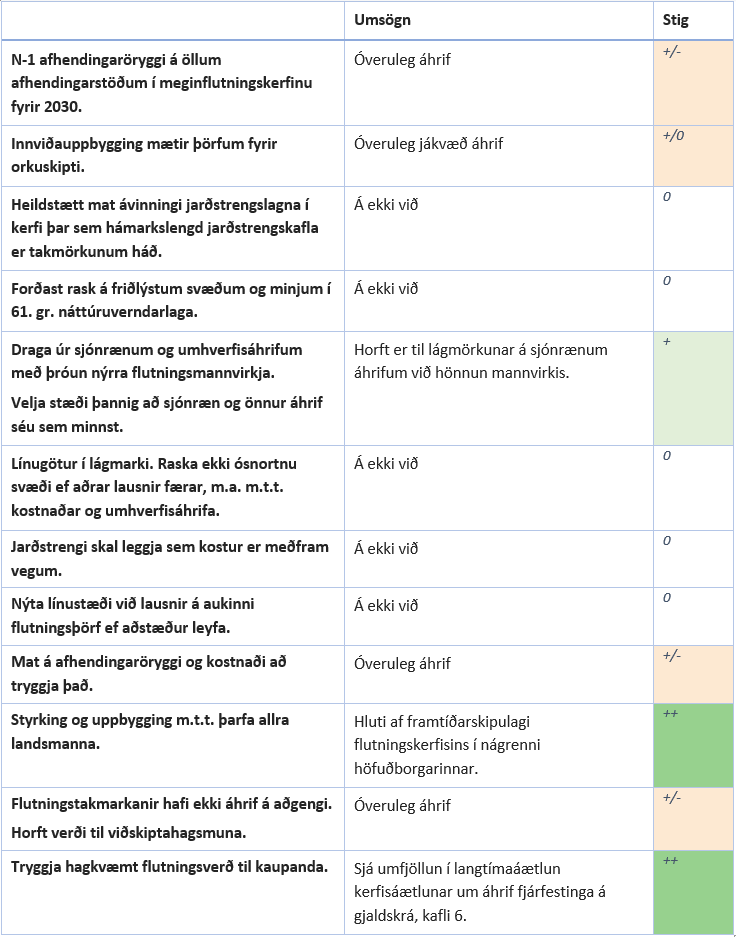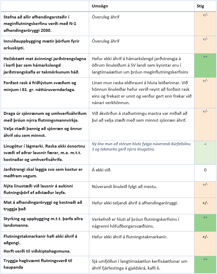 Tafla 3-200 sýnir samantekt á því hvernig aðalvalkostur er talinn uppfylla markmið raforkulaga og stefnu stjórnvalda um uppbyggingu flutningskerfis. Nánari lýsingu á matinu má finna í töflu 3-215, mynd 3-75 og undirkaflanum niðurstaða valkostagreiningar.