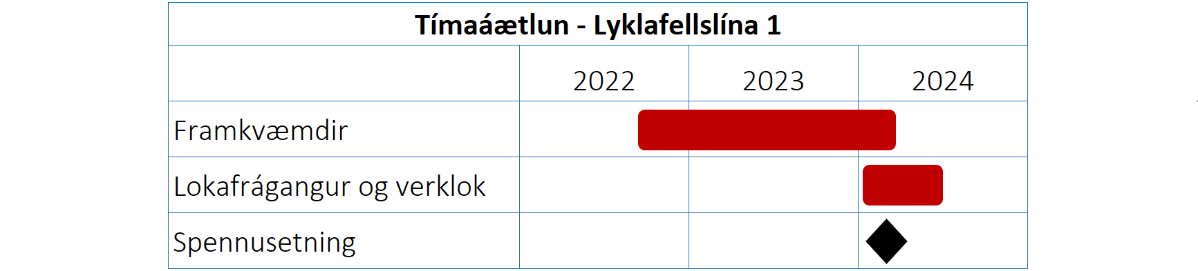 Gert er ráð fyrir að framkvæmdir hefjist á síðari hluta árs 2022 og að þeim ljúki með spennusetningu í byrjun árs 2024. Gert er ráð fyrir lokafrágangur og lúkning fyrir verkefnið ásamt tengdum verkefnum verði í gangi fram árið 2024.