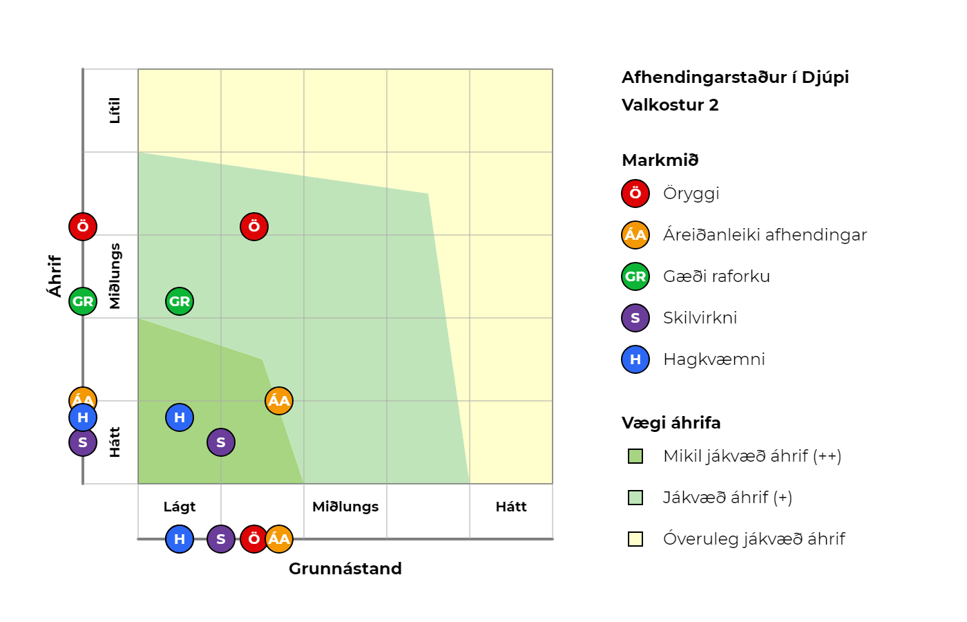 Tafla 3-193 sýnir niðurstöðu mats á því hver einkenni áhrifa valkosta eru á þá matsþætti sem notaðir eru til að mæla uppfyllingu markmiðs raforkulaga um gæði raforku. Eins og sést á töflunni eru áhrif beggja valkosta á Kerfisstyrk metin miðlungs. Ástæða þess er að tengivirki í Djúpi opnar möguleika á tengingu orkuvinnslu á svæðinu sem hækkar skammhlaupsafl og þar með kerfisstyrk. Áhrif valkosts 1 á Spennusveiflur/spennuþrep eru metin há og er ástæða þess sú að spennusveiflur minnka og óverulegar líkur eru á spennuþrepi við spennusetningu á loftlínunni. Áhrif valkosts 2 á Spennusveiflur/spennuþrep eru metin miðlungs og er ástæða þess sú að spennusveiflur minnka í kerfinu en töluverðar líkur eru á spennuþrepi við spennusetningu á jarðstreng að tengivirki. Áhrif á Afhendingarspennu/vikmörk eru metin töluverð (næsthæsti flokkur) fyrir báða valkosti og er ástæða þess sú að í báðum tilfellum eykst kerfisstyrkur og þar með lagast gildi afhendingarspennu á áhrifasvæði framkvæmdarinnar.