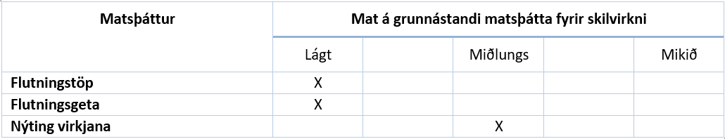 Tafla 3-212 sýnir niðurstöðu mats á því hver einkenni áhrifa valkosta eru á matsþætti fyrir skilvirkni. Eins og sést á töflunni eru áhrif valkostanna á Flutningstöp, Flutningsgetu og Nýtingu virkjana lítil þar sem nýtt eða endurbyggt tengivirki hefur engar kerfislegar breytingar í för með sér.