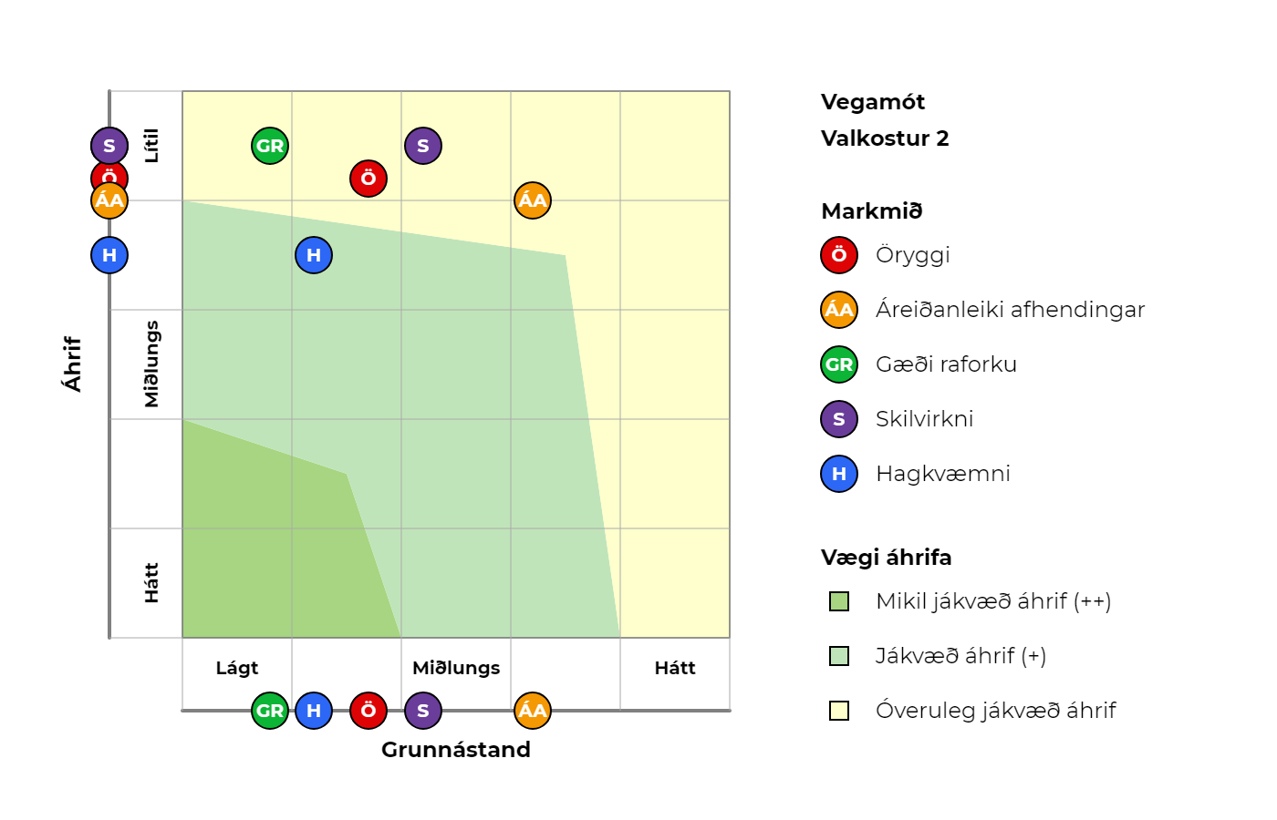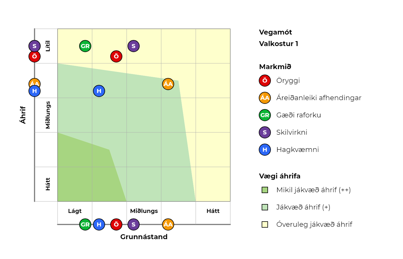 Með greiningum eru áhrif skoðaðra valkosta á matsþætti öryggis metin og er niðurstaða matsins eftirfarandi: