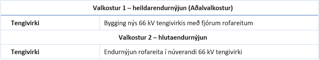 Skoðaðir hafa verið tveir valkostir við endurnýjun virkisins. Valkostur 1 sem er yfirbyggt nýtt tengivirki í stað þess gamla kemur örlítið betur út úr samanburðinum á niðurstöðu mats á uppfyllingu markmiða raforkulaga. Einnig er valkostur 1 hagkvæmari.
