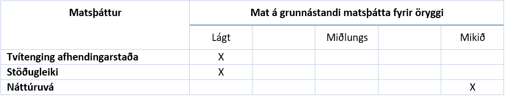 Tafla 3-206 sýnir niðurstöðu mats á því hver einkenni áhrifa skoðaðra valkosta eru á matsþætti fyrir öryggi. Eins og sést á töflunni hafa báðir valkostir lítil áhrif á grunnástandið. Þó eykst stöðugleikinn aðeins þar sem verið er að skipta út gömlum búnaði fyrir nýjan.