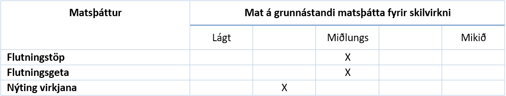 Lagt hefur verið mat á það hvernig valkosturinn uppfyllir markmið um skilvirkni. Grunnástand hefur verið metið fyrir alla matsþætti sem ná yfir skilvirkni.