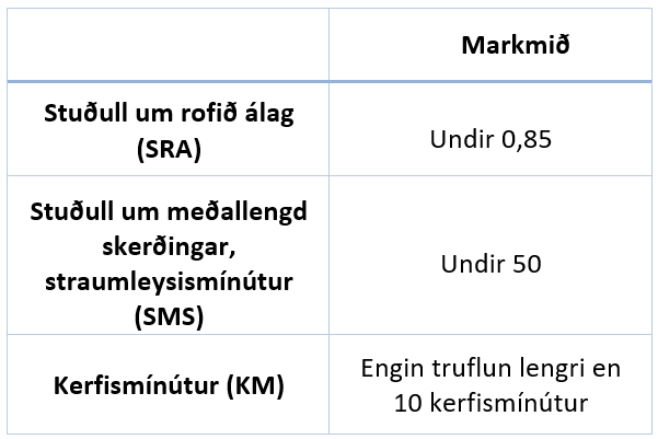 - Kerfismínútur (KM) Landsnet hefur sett sér markmið varðandi þessa þrjá stuðla og eru þau eftirfarandi