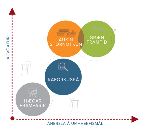 Í sviðsmyndinni Græn framtíð er gert ráð fyrir meiri hagvexti en í Raforkuspá og aukinni áherslu á umhverfismál. Má t.d. nefna að orkuskipti ganga hraðar fyrir sig í sviðsmyndinni en í Raforkuspá og er árlegur vöxtur almennrar raforkunotkunar í þessari mynd um 2,2%. Notkunin rúmlega tvöfaldast hér til loka spátímabilsins og verður um 8.400 GWh á ári. Heildarorkuþörf kerfisins er áætluð um 25.650 GWh eða um 1.400 GWh hærri en fyrir grunnsviðsmynd Raforkuspár árið 2050.