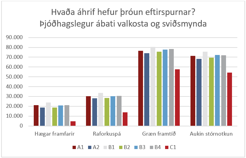 Þegar allt er tekið saman er niðurstaðan sú að valkostur C er ótvírætt óhagkvæmari en aðrir valkostir. Þjóðhagslegur ábati er mismikill eftir sviðsmyndum en alltaf lægstur í valkosti C.1. Að meðaltali skilar hann ábata upp á 32,5 milljarða á tímabilinu fram til 2050 en valkostir A.1 og B.1 skila 49,9 og 48,1 milljarði hvor um sig.