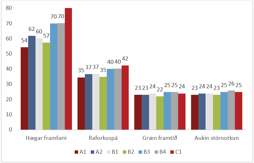 Þegar valkostir A, B og C eru bornir saman sést að valkostur C.1 felur í sér minnstu breytingar á flutningskostnaði. Gagnvart stórnotendum í valkosti C.1 mætti búast við allt frá 4% lækkun á flutningskostnaði upp í 8% hækkun eftir því hvaða raforkusviðmynd raungerist. Sambærilegar breytingar fyrir dreifiveitur yrðu á bilinu 13% lækkun upp í 6% hækkun. Sá valkostur sem hefði mest áhrif á flutningskostnað er Valkostur A með hraðri uppbyggingu. Í þeim valkost yrðu hækkanir á flutningskostnaði stórnotenda á bilinu 4-22% og breytingar hjá dreifiveitum yrðu breytingarnar á bilinu 4% lækkun upp í 15% hækkun.