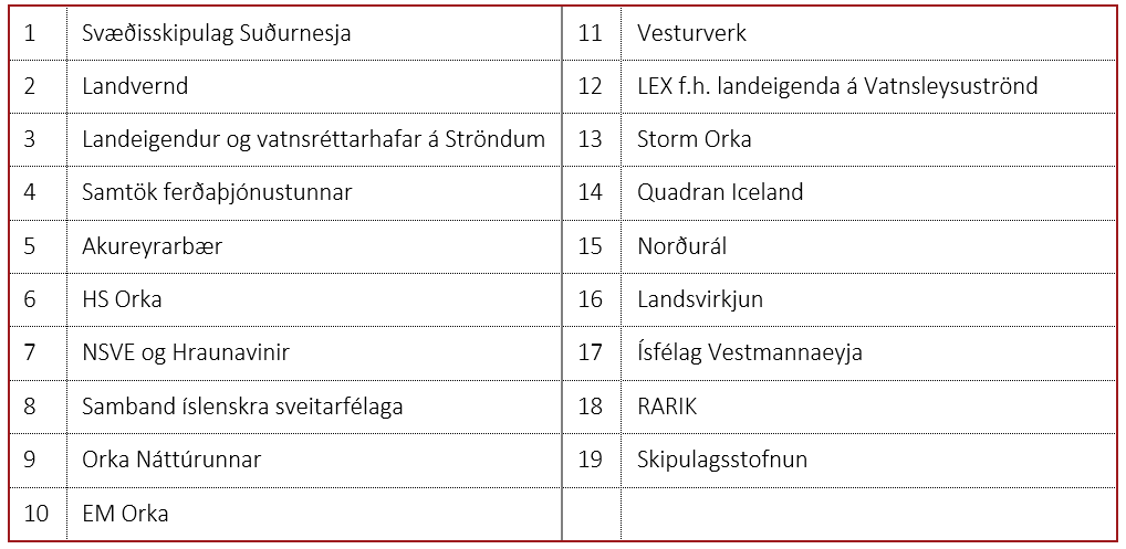 Tafla 1.1 Yfirlit yfir aðila sem sendu inn athugasemdir