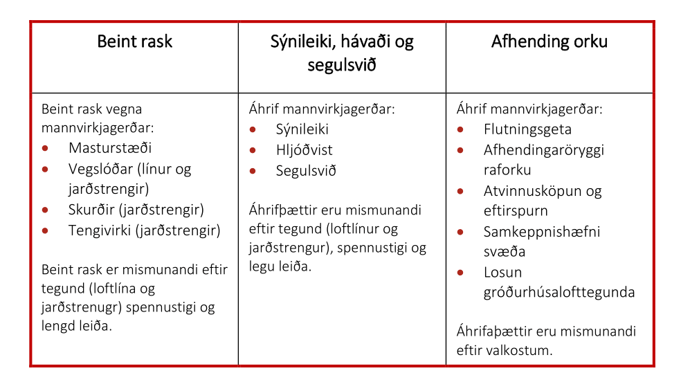 Við mat á mögulegum áhrifum á umhverfisþætti vegna uppbyggingar flutningskerfisins er litið til helstu áhrifaþátta kerfisáætlunar. Áhrifaþáttum er skipt í þrjá megin flokka. Þessir þrír flokkar hafa mismunandi áhrif á umhverfisþætti sem eru til skoðunar (Tafla 5.1) þótt í ákveðnum tilvikum kunni þeir að hafa áhrif á sömu þættina.
