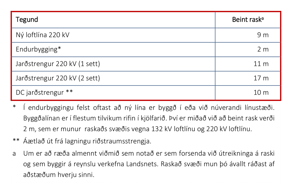 Þegar fjallað er um umfangsvæða sem verða fyrir beinu raski er gert ráð fyrir að allir framkvæmdaþættir séu þar taldir með,mastursstæði, vegslóðar, skurðir og tengivirki. Í kafla 6.2 er gerð grein fyrir mismunandi stærð helgunarsvæða og raskaðra svæða eftir því hvort um er að ræða loftlínu eða jarðstreng.