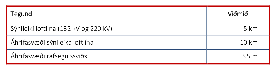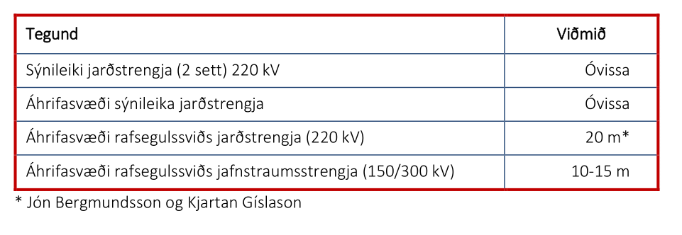 Rafsegulsvið. Miðað er við að áhrifasvæði rafsegulssviðs sé 95 m, þ.e. 42,5 m frá loftlínustæði (Tafla 5.4). Rafsvið skermaðs jarðstrengs nær ekki út fyrir strenginn sjálfan, en segulsvið er alltaf til staðar og er segulsvið jarðstrengja sterkast á takmörkuðu svæði beint yfir strengnum og minnkar hratt út til hliðanna. Helgunarsvæði jarðstrengja á spennustiginu 220 kV er 12-20 m fyrir tvö aðskilin strengsett með vegslóð á milli. Helgunarsvæði loftlína er hins vegar talsvert breiðara. Það er 45-70 m fyrir 220 kV línur. Breidd helgunarsvæðis er háð mastragerð, haflengdum og fleiri þáttum. Innan helgunarsvæða eru ýmsar takmarkanir á landnotkun.