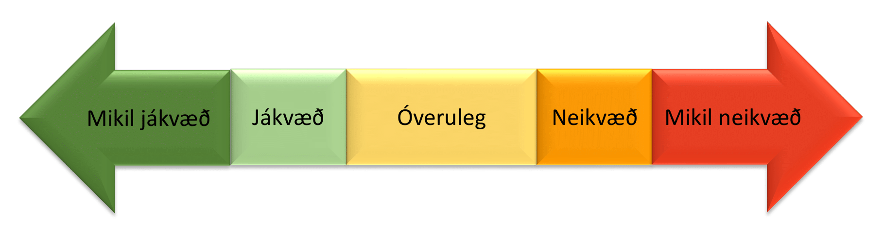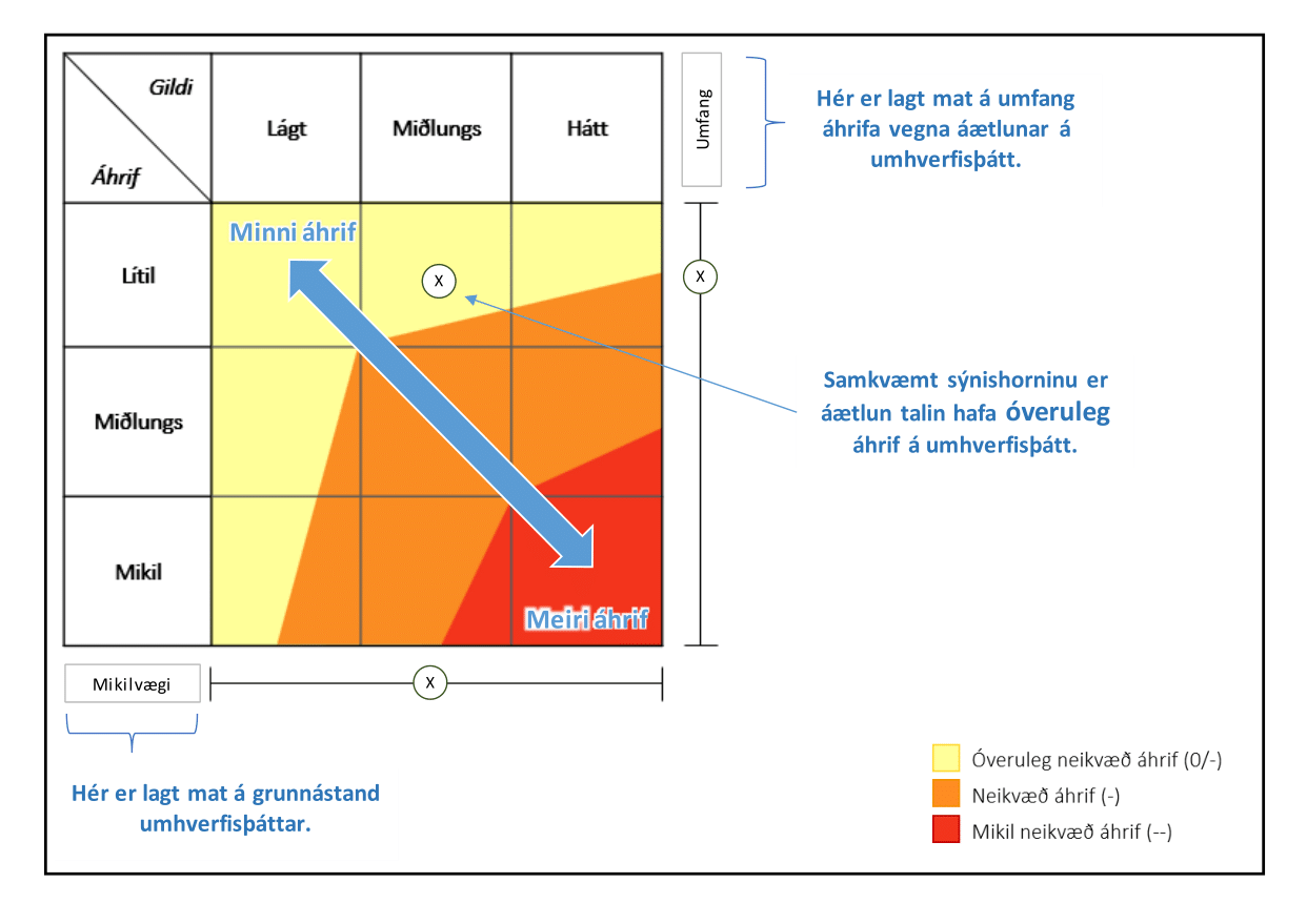 - Einkenni áhrifa eru metin með hliðsjón af eðli framkvæmdar, einnig á þriggja þrepa skala. Við matið var gjarnan horft til beinna og óbeinna áhrifa framkvæmdarinnar á viðkomandi umhverfisþátt.