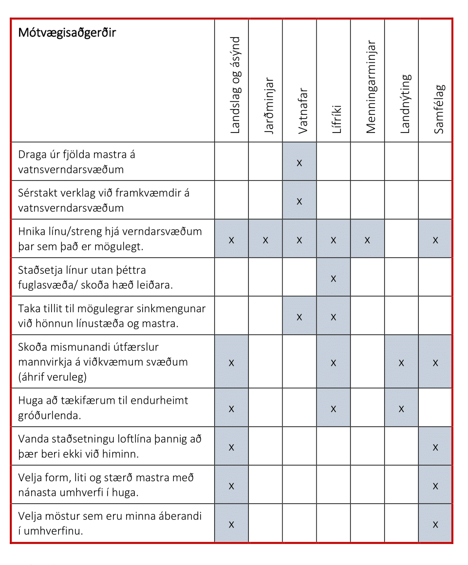 Landsnet hefur tilgreint mótvægisaðgerðir, sem litið verður til á síðari stigum þ.e.a.s. við undirbúning einstakra framkvæmda (Tafla 10.1). Við mótun þeirra var tekið tillit til ábendinga sem komu fram í fyrra umhverfismati og greiningu á fjölda umhverfisþátta innan áhrifasvæða A | hálendisleið og B | byggðaleið.